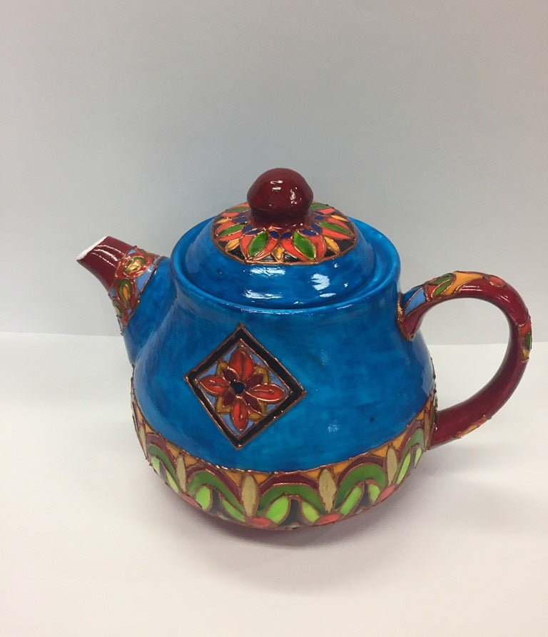 This amazing ceramic Tea pot is hand painted and the vibrant colors make this piece of art a beautiful gift.